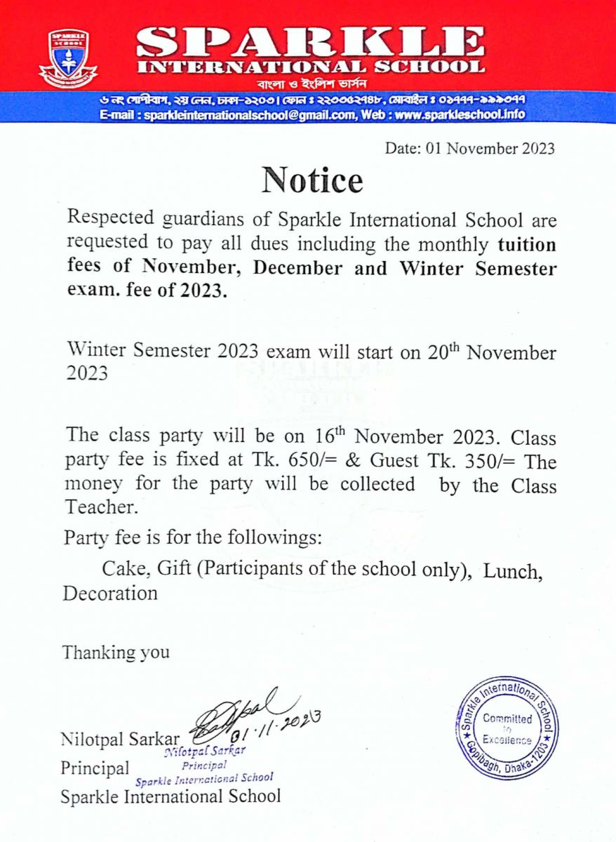 Payment Notice of Nov, Dec, Exam. Fee & Class Party 2023 Published on Wednesday, November 1, 2023